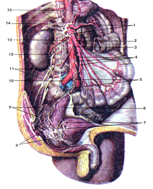 Рисунок 364. Брюшное аортальное сплетение (plexus aorticus abdominalis) и другие вегетативные сплетения брюшной полости и таза. Вид спереди и немного справа. Печень, желудок, а также брюшина и правый мочеточник удалены. 1 - чревное сплетение; 2 - верхнее брыжеечное сплетение; 3 - брюшное аортальное сплетение; 4 - нижнее брыжеечное сплете-ние; 5 - верхнее подчревное сплетение; 6 - прямая кишка; 7 - мочепузырное сплетение; 8 - пра-вое нижнее подчревное сплетение; 9 - крестцовое сплетение; 10 - правая обшая подвздошная артерия; 11 - поясничное сплетение; 12 - симпатический ствол; 13 - аорто-почечный узел; 14 -надпочечниковое сплетение; 15 - большой внутренностный нерв.