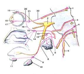 Рисунок 365. Головной отдел парасимпатической части вегетативной нервной системы. 1 -добавочное ядро глазодвигательного нерва; 2 - тройничный узел; 3 - верхнее слюноотделитель-ное ядро; 4 - нижнее слюноотделительное ядро; 5 - блуждающий нерв; 6 - барабанный нерв; 7 -околоушная слюнная железа; 8 - барабанная струна; 9 - поднижнечелюстной узел; 10 -поднижнечелюстная слюнная железа; 11 - подьязычная слюнная железа; 12 - ушной узел; 13 -малый каменистый нерв; 14 - большой каменистый нерв; 15 - крылонебный узел; 16 -соединительная ветвь со скуловым нервом; 17 - ресничная мышца; 18 - мышца, суживающая зрачок; 19 - слезная железа: 20 - короткие ресничные нервы; 21 - ресничный узел; 22 -глазодвигательный корешок (парасимпатический).