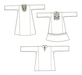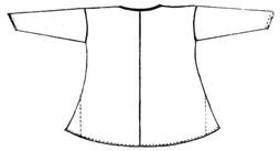 | Одно полотно, перегнутое по плечам, с боковыми клиньями от рукава до низа, длинными широкими рукавами и ластовицей. |