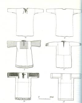 1) прямое, отмеренное по росту, сложенное по утку пополам полотнище, к которому по бокам пришиты вставки, расширяющие стан рубахи; на линии плеча, приходящейся на середину сложенного пополам куска, пришиваются рукава, состоящие из поперечных полос той же материи;