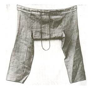 | Широкие штаны с широкой ромбовидной, низко посаженной мотней. Верхний край отгибался на наружную сторону и подшивался широким рубцом для продевания шнура-завязки. |