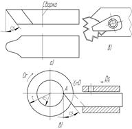 Для получения заднего угла режущей части резца, обеспечения технологичности конструкции (в этом случае профиль режущей кромки располагается на концентрической поверхности, представляющей поверхность вращения) и получения максимального запаса на переточку резца, как правило, используется конструкция, имеющая одну режущую часть. Вершина режущего клина в рабочем положении резца располагается ниже его оси на величину hр. Это обеспечивает получение положительного заднего угла режущей части в плоскости, перпендикулярной оси детали (рис.3.3, б, в).