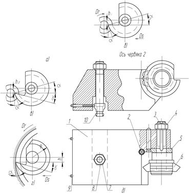 | Рис. 3.3. Круглый фасонный резец: а -резец, б, в -схемы обработки наружной поверхности резцом с γ=0 (б) и γ>0 (в); г -схема обработки внутренней поверхности; д -резцедержатель: 1-корпус; 2-винт поворота зубчатого сектора рычага; 3-ось; 4-гайка; 5-рычаг; 6-резец; 7-гайка крепления резцедержателя; 8-винт; 9-винт регулирования шпонки; 10-шпонка |
