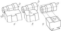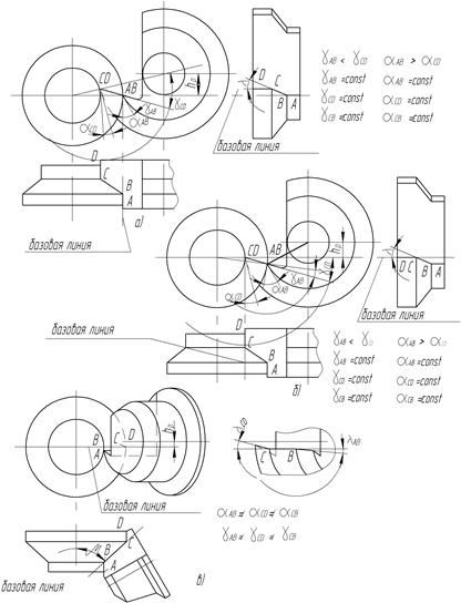 | Рис. 3.11. Варианты расположения базовой линии по режущим кромкам: АВ (а), СD (б) и BС (в) |