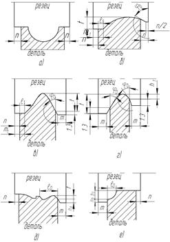 1. При наличии крайних участков профиля детали, параллельных оси резца (рис.3.12, а, б, в, д, е) или при наличии вогнутых профилей изделия со стороны открытого торца заготовки резец по профилю должен перекрывать деталь на величину