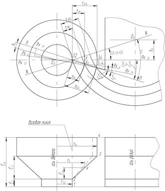 | Рис. 3.22. Размеры профилей детали tд и резца в передней tп и нормальной tN плоскостях в узловых 3,4 и произвольной Х точках |