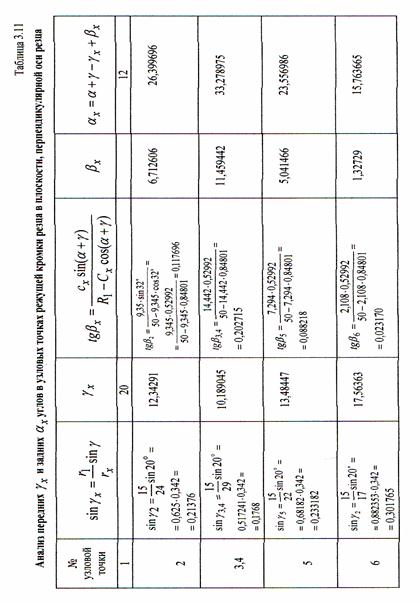 , расположенные в плоскостях, проходящих через узловые точки нормально к участкам режущей кромки. Результаты расчетов также сводим в табл. 3.12 и 3.13.
