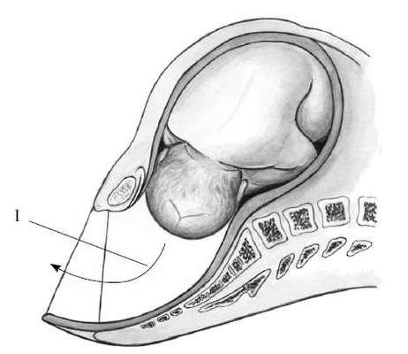 Рис. 9.8. Схематическое изображение родовых путей в период изгнания. 1 - проводная ось таза, по которой проходит головка малым размером