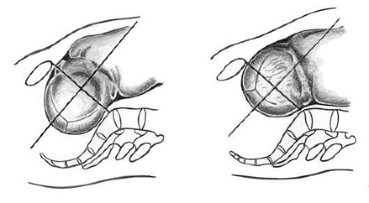 При асинклитическом вставлении вертикальная ось головки плода относится к плоскости входа в таз не строго перпендикулярно, а стреловидный шов располагается ближе к мысу - передний асинклитизм (рис. 9.10, а) или к лону - задний асинклитизм (рис. 9.10, б).
