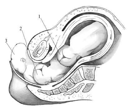 Рис. 9.12. Продвижение головки по проводной оси таза.1 - вход в полость малого таза; 2 - внутренний поворот головки в полости таза; 3 - разгибание и рождение головки