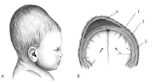 Рис. 9.13. А - Конфигурация головки при затылочном предлежании; Б - Родовая опухоль на головке новорожденного:1 - кожа; 2 - кость; 3 - надкостница; 4 - отек клетчатки (родовая опухоль)