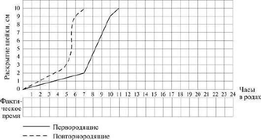 В общей сложности продолжительность латентной фазы у первородящих составляет 4-8 ч, у повторнородящих - 4-6 ч. Раскрытие шейки матки в латентной фазе происходит постепенно, что отражено на партограмме (рис. 9.15).