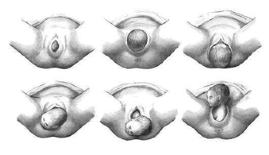 Течение родов в периоде изгнания (второй период родов). После полного открытия шейки матки и излития околоплодных вод родовая деятельность усиливается. На вершине каждой схватки к сокращениям матки присоединяются потуги. Сила потуг направлена на изгнание плода из матки. Под их влиянием головка, а за ней туловище опускаются по родовым путям ведущей точкой по проводной оси таза. По мере продвижения головка давит на нервные крестцовые сплетения, вызывая непреодолимое желание тужиться и вытолкнуть головку из родовых путей.