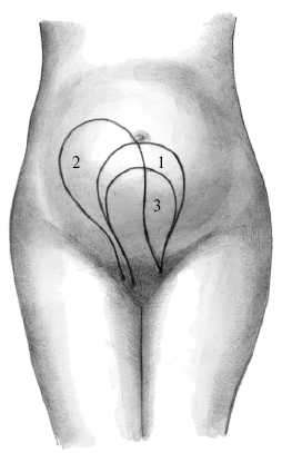 Рис. 9.17. Высота стояния дна матки в III периоде родов в процессе отделения и выделения последа. 1 - сразу после рождения плода; 2 - после отделения последа; 3 - после рождения последа