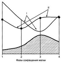 Рис. 10.4. Характер изменения интенсивности маточно-плацентарного и фетоплацентарного кровотока в зависимости от фаз сокращения матки.