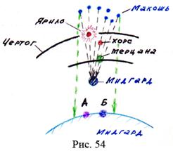 Поэтому если это разбирать чисто в явных структурах, то получится следующее (рис. 54). Вот чертог, и я рисую движение Ярило, как мы его видим на небосклоне, а вот Макошь и Мидгард.