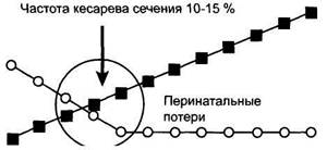 Уменьшение частоты перинатальных потерь благодаря увеличению частоты кесарева сечения возможно только до определенного предела. Оптимальной частотой этой операции, которая позволяет снизить перинатальные потери, считается 10—15 %. Далее перинатальные потери не уменьшаются, по данным ВОЗ (рис. 25.1).