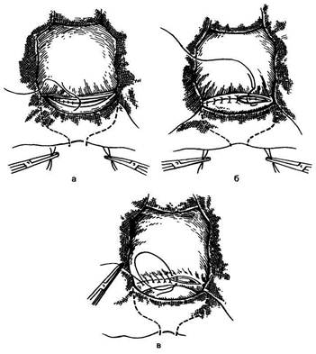 Целесообразно также использование непрерывного однорядного шва через все слои с захлестом лигатур или обычного однорядного обвивного шва через все слои с захватом эндометрия.