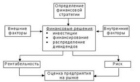Поскольку целью предприятия является максимизация своей стоимости, роль финансиста заключается в поиске капиталовложений, создающих ценности, и в выборе таких видов инвестиций и способов финансирования, которые позволили бы обеспечить наиболее высокую стоимость предприятия. Согласно выбранной финансовой стратегии и под влиянием внешних и внутренних факторов финансовый менеджер принимает соответствующие решения. Оценка предприятия на рынке зависит от степени доходности и риска принимаемых финансовых решений.