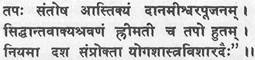 цать ниям: ментальное удовольствие, удовлетворенность, молчание, контроль над органами чувств, сострадание, вежливость, вера в Высшее, открытость, способность прощать, чистота мыслей и эмоций, ненасилие, умеренность, терпение, воздержанность; купание, чистота, правда, повторение мантр, жертвоприношение воды, аскетизм, самоограничение, способность переносить боль и страдание, благоговейное поклонение, обет соблюдения обрядов, соблюдение постов.