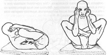 Затем сцепите кисти позади шеи или ухватитесь ими за уши или плечи. Это называется также гарбхасаной, позой эмбриона. В конечной стадии дыхание будет поверхностным, потому что живот и легкие сильно стиснуты. Чтобы выйти из этой позы, сначала отсоедините кисти, затем разогните ноги и полежите плоско в шавасане в течение нескольких минут. Важно, чтобы эта асана выполнялась на одеяле, иначе вы можете повредить выступающие спинные позвонки.