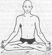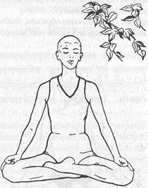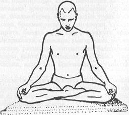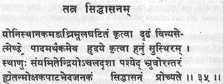 Прижми пятку одной ноги к промежности, а ступню другой ноги помести выше гениталий. Сделав это, опусти подбородок к груди. Оставаясь спокойным и уравновешенным и, контролируя органы чувств, пристально и неотрывно всматривайся в точку между бровями. Это взламывает дверь к освобождению. Это называется сиддхасаной.