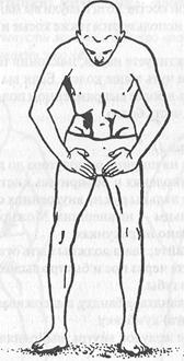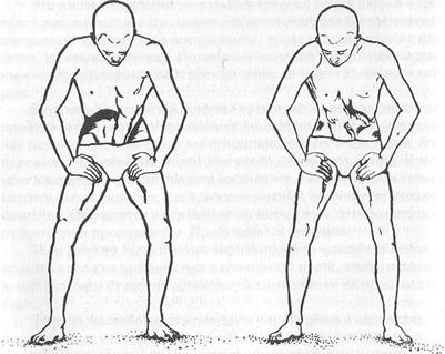 Расставьте ноги на ширину от полутора до двух футов. Согните ноги в коленях и обопритесь кистями чуть выше колен; большие пальцы рук на внутренних сторонах бедер, а остальные пальцы — на внешних. Можно держать кисти и так, как показано на рисунках. Голову не опускайте; глаза должны быть открыты. Глубоко вдохните через нос и быстро выдохните через рот, слегка сморщив губы.
