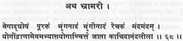 Быстро вдохни воздух, произведя громкий звук, подобный жужжанию трутня, и медленно выдохни, производя более тихий звук жужжащей пчелиной матки. Посредством этой практики практикующий становится господином йогов, а ум его погружается в блаженство.
