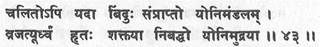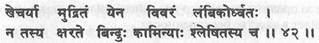 (42) Когда посредством выполнения кхечари мудры закрывается полость у верхнего неба, бинду, или семя, не может быть потеряно, даже если ты лежишь в объятиях прекрасной женщины.