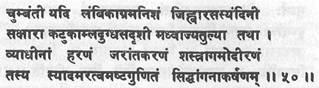 Когда язык постоянно прижимается к полости, лунный нектар (течет и) имеет солоноватый, кислый и острый вкус. По плотности он подобен молоку, топленому маслу, меду. Человек не подвержен смертельным болезням, старению и воздействию оружия. Это способствует бессмертию и восьми сиддхам, или совершенствам.