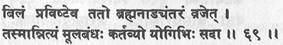 (69) Как змея вползает в свою нору, так и кундалини входит в брахма нади. Поэтому йог всегда должен выполнять мула бандху.