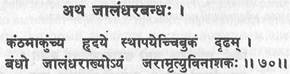 (70) Сжатие горла, достигаемое за счет приближения подбородка к груди, есть бандха, называемая джаландхарой. Она уничтожает старость и смерть.