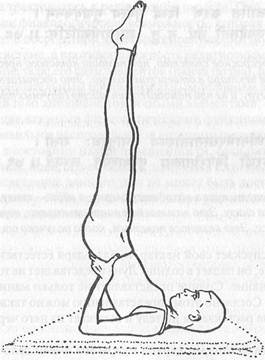 Поднимите ноги, заведите их слегка за голову, чтобы спина приподнялась, и поддержите спину кистями рук. Поднимите ноги вверх ступнями к потолку, заставив спину принять угол сорок пять градусов по отношению к полу. Поддерживайте нижнюю часть спины кистями; локти при этом расположены на полу позади спины. Положение рук можно приспособить так, чтобы вы стояли устойчиво.