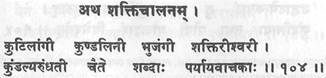 Слово «кутиланга» состоит из двух корней: кут, что означает «рваться на части», и анга, что означает «часть». Этот термин относится к большой силе и к пути ее прохождения через тело, устраняющей функции иды и пингалы. Слово «кундалини» содержит корень кунд, означающий конкретный тип сосуда для сохранения огня, и кундалин, означающий змею. Муладхара представляет собой кунд, а высвобождаемый из нее огонь поднимается, как змея. Кундали, бхуджанги, наги, пхани, сарпини — это все названия змеи женского рода. Шеша тоже является змеей, но это имеет отношение к Вишну, поскольку он опирается на Шешу. Шакти — это космическая энергия. Ишвари — это созидательная сила Ишвары, космического каузального тела. Слово «арундхати» составлено из слов арун, что означает «рассвет», и дхати, что означает «генерировать» или «создавать». Слово арундхата означает «беспрепятственный».
