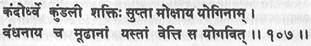(107) Кундалини шакти спит над кандой. Эта шакти является средством освобождения йога и рабством для невежественного. Тот, кто знает ее, знает йогу.