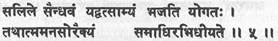 В «Хатхаратнавали» говорится: «На этой стадии (самадхи) дживатма и параматма удерживаются в состоянии равновесия, в котором полностью прекращена ментальная деятельность». Для того чтобы сплавить индивидуальный ум с параматмой, должна быть искоренена причина создания индивидуальности. Индивидуальность имеет место, когда в уме существуют флуктуация (вритти) и желание (васана). Чем более сильной является васана, тем меньше чистоты остается у сознания и тем в большей степени ум втянут в грубые флуктуации. Пока ум не станет кристально чистым и свободным от этих воздействий, концентрация, медитация и самадхи не могут иметь место.