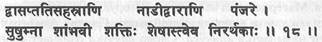 «Внутри нее находится читрини, которая сияет сиянием праны и которую достигает йог, занимаясь йогой. Она (читрини) является тонкой, как нить паутины, пронизывает все лотосы (чакры), которые расположены в позвоночнике, и являет собой чистый интеллект (способность различения). Она (читрини) является прекрасной из-за них (лотосов), которые нанизаны на нее. Внутри нее находится брахма нади, которая простирается от отверстия рта Хары (муладхара) до более высокого места, где обитает Адидева (сахасрара)».