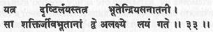 (33) Там куда направлен взгляд, возникает поглощение. То, в чем элементы, чувства и шакти существуют внешним образом, и то, что есть во всех живых существах, — оба растворяются в том, что не имеет характеристик.