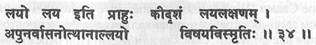 В состоянии медитации, когда медитирующий, объект медитации и процесс медитации являются не тремя раздельными переживаниями, а единым переживанием, в уме нет никаких мыслей. Ум тотально поглощен, и это есть лайя. В ведической и тантрической традициях лайей называется поглощение таттв. Это означает поглощение грубой и индивидуальной энергии, или шакти, ее первоначальным космическим состоянием. Другие говорят о поглощении ума сознанием. И то и другое относится к одному и тому же. Индивидуальный ум является продуктом шакти, а первоначальное состояние шакти находится в тотальном равновесии с сознанием. Однако лайя должна определяться и пониматься как состояние тотальной унификации и отождествления с объектом концентрации, когда не существует переживания «я».