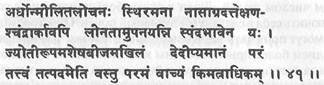 Ум уравновешен, глаза полуоткрыты, взгляд зафиксирован на кончике носа, луна (ида) и солнце (пингала) приостановлены, нет никакого движения (психического или ментального) — ты достигаешь формы света (джьоти), которая является бесконечной и полной, лучащейся, которая есть Высшее. Что еще можно сказать?