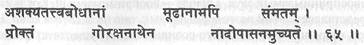(65) Я опишу предложенную Горакхнатхом концентрацию на надах, которая достижима даже для необученного, кто не в состоянии постичь То (таттву).