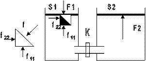 Если надавить на поршень силой F1, то в жидкости будут созданы внутренние напряжения (давления). Рассмотрим условия равновесия элементарного объема жидкости, имеющего форму кубика. На единицу его поверхности будет действовать сжимающая сила fii=-piini, направленная противоположно нормали ni к i-ой поверхности. Поскольку силы, действующие на противоположные грани кубика, равны по величине, то p11=F1/S1. Равенство давлений р11 и р22 следует из условия равновесия половины кубика, выделенного более темным цветом и изображенного на фрагменте. Действительно, f11= f22 = f /(2)0,5. Поэтому р22=р11. Рассматривая равновесие элементарных объемов в различных точках жидкости, получим условие: