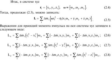 Векторы ri, w и L можно проектировать как на оси лабораторной системы XYZ, так и на оси системы xyz, жестко связанной с твердым телом (поскольку точка О неподвижна, начала обеих систем можно совместить). Преимущество системы xyz заключается в том, что в ней проекции r i являются постоянными величинами (в системе XYZ они зависят от времени), и выражения для компонент L оказываются проще.