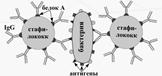 Механизм. Основан на том, что находящийся на поверхности золотистого стафилококка белок А селективно реагирует с Fc-фрагментом IgGl, G2, G4, оставляя свободными антидетерминанты Ат, которые, взаимодействуя с гомологичным Аг, вызывают агглютинацию стафилококков. Для постановки КОА применяют коммерческие стафилококковые реагенты, содержащиеся в ампулах или высушенные в лунках полистироловых пластин или предметных стекол. К реагенту добавляют 0,01-0,1 мл исследуемой культуры или растворимого Аг, инкубируют при комнатной температуре 10-30 мин (в условиях постановки реакции на стекле) или 18 -20 ч (в условиях постановки реакции в капиллярах). Учет проводят так же, как при обычной РА. Агглютинацию учитывают по количеству осадка и степени просветления жидкости. Реакцию считают положительной, если агглютинация отмечается в разведении, близком к титру диагностической сыворотки. Одновременно учитывают контроли: сыворотка, разведенная изотоническим раствором натрия хлорида, должна быть прозрачной, взвесь микробов в том же растворе — равномерно мутной, без осадка.