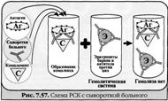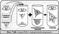 Механизм. РСК проводят в две фазы: 1-я фаза — инкубация смеси, содержащей три компонента антиген + антитело + комплемент; 2-я фаза (индикаторная) — выявление в смеси свободного комплемента путем добавления к ней гемолитической системы, состоящей из эритроцитов барана, и гемолитической сыворотки, содержащей антитела к ним. В 1-й фазе реакции при образовании комплекса антиген—антитело происходит связывание им комплемента, и тогда во 2-й фазе гемолиз сенсибилизированных антителами эритроцитов не произойдет; реакция положительная. Если антиген и антитело не соответствуют друг другу (в исследуемом образце нет антигена или антитела), комплемент остается свободным и во 2-й фазе присоединится к комплексу эритроцит — ан-тиэритроцитарное антитело, вызывая гемолиз; реакция отрицательная.