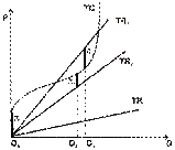 Во втором случае (TR2) кривая дохода на всем своем протяжении находится ниже издержек, т. е. прибыли быть не может. Однако разрыв между обеими кривыми а именно так графически отражается размер убытка неодинаков. Вначале убытки значительны. Затем по мере роста производства они снижаются, достигая при выпуске Q2 единиц продукции своего минимума (2). А потом начинают вновь расти. Очевидно, что выпуск Q2 единиц продукции в этих условиях оптимален для фирмы, так как обеспечивает ей минимизацию убытков.