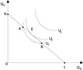 Графически система предпочтений потребителя изображается с помощью кривых безразличия. Кривая безразличия - это геометрическое место точек, каждая из которых представляет собой такой набор из двух товаров, что потребителю безразлично, какой из этих наборов выбрать. Кривая безразличия показывает альтернативные наборы товаров, обеспечивающие потребителю одинаковый уровень полезности (рис. 2).