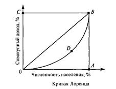 Каждая точка на кривой Лоренца соответствует утверждению «20 самых бедных процентов населения получают всего 7 % дохода». В случае равного распределения каждая группа населения имеет доход, пропорциональный своей численности. Такой случай описывается биссектрисой ОВ (линия абсолютного равенства). Случай полного неравенства (когда лишь один член общества имеет доход) описывает линия OAВ (линия абсолютного неравенства). Кривая Лоренца заключена между кривыми равенства и неравенства. Реальное распределение доходов в обществе характеризуется кривой ODB и степенью ее отклонения от биссектрисы.
