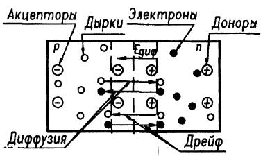 Поскольку концентрация электронов в n-области значительно больше, чем в p-области, а концентрация дырок в p-области больше, чем в n-области, то на границе раздела полупроводников возникает градиент концентрации подвижных носителей заряда (дырок и электронов):