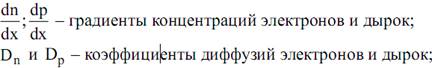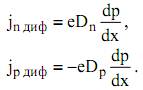 Направленное движение свободных носителей, вызванное их неравномерным распределением в объеме полупроводника, называют диффузионным движением. Электроны под действием диффузии перемещаются из p–области в n–область. Это движение зарядов (основных носителей) образует диффузионный ток p-n-перехода, содержащий две составляющие: электронную и дырочную, плотность которых равна: